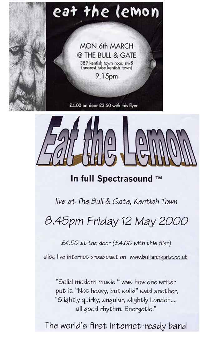 Seroius music venue in real Kentish Town, The Bull & Gate has a large satge and at the time and almost unprecendented live webcast. Yes we played live across the world - people in Italy, Australian and Friern Barnet (all of whom supplied us with first hand accounts of the experience) were able to witness the awesome power of the world wide internet. To the delighted viewers we It looked like a bunch of ghosts drifting (or rather jerking) across a tiny postage stamp sized screen. Still, it got us a return gig.