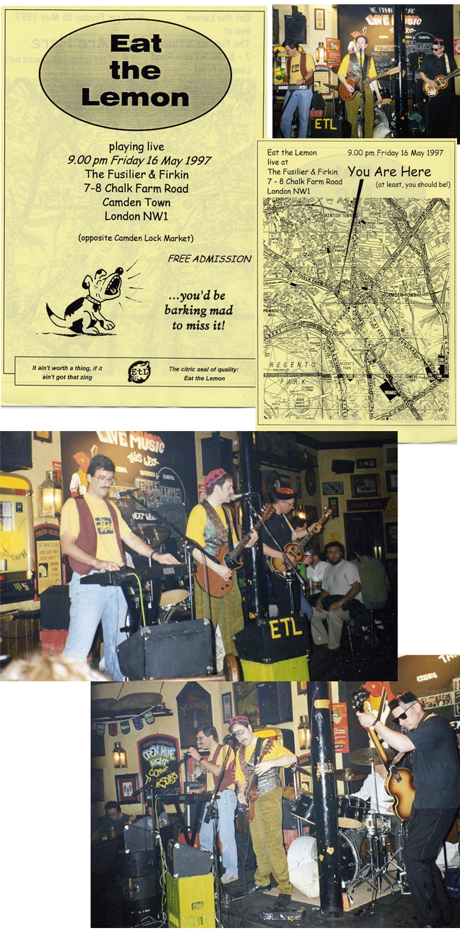 Camden's Fusilier & Firkin (which has now reverted to its more familiar name of "The Carnarvon Castle") was a free-entry pub where we played in 1997. The strangely shaped room layout meant that we were along one wall of a long narrow room facing... the bar. We played for over two hours and a great crowd cheered us on for encores and then, well, left. The highlight: Geoff's Victorian smoking hat.