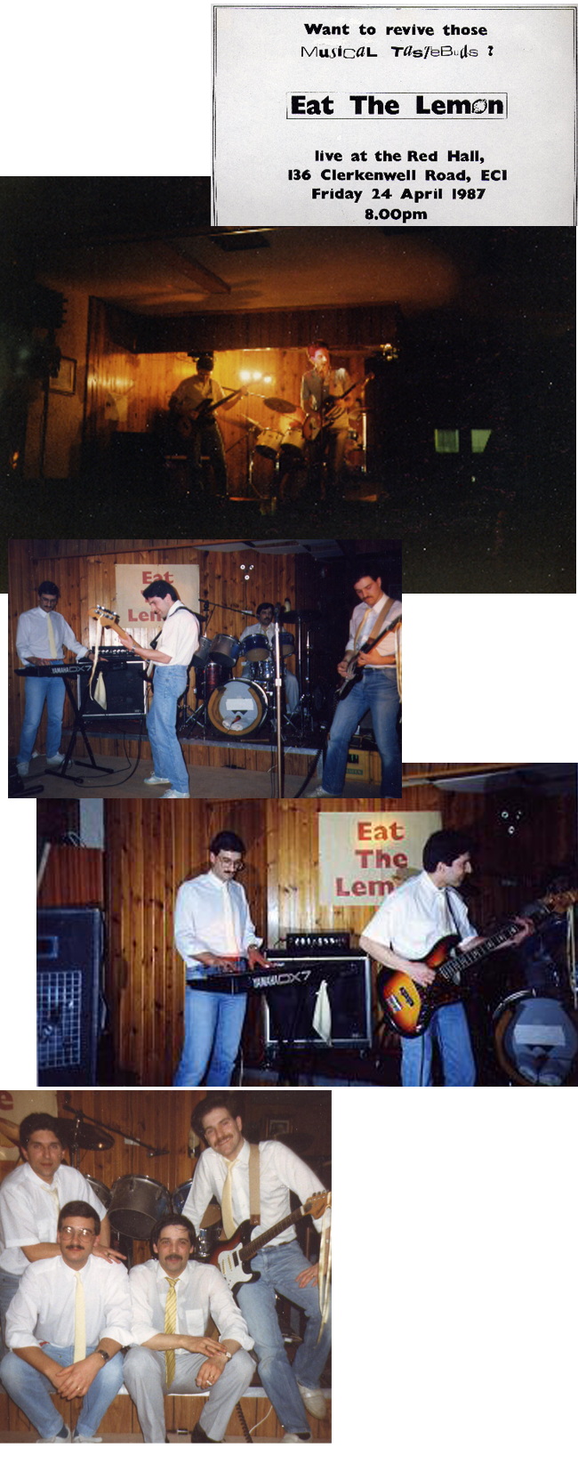 It was logical that our first gigs should be held close to the (free) rehearsal facilites that we were afforded by the Italian Social Club in Clerkenwell. Known then as The Red Hall the club's main meeting room was a long, oddly shaped affair. Not that this stopped us putting on a string of shows in the 1980s, each one a memorable occasion. This one from 1987, one of the first to feature a youthful Peter Dieck (of Pete's Diary fame) was particularly noteworthy for the matching jeans/yellow tie/white shirt combos. .