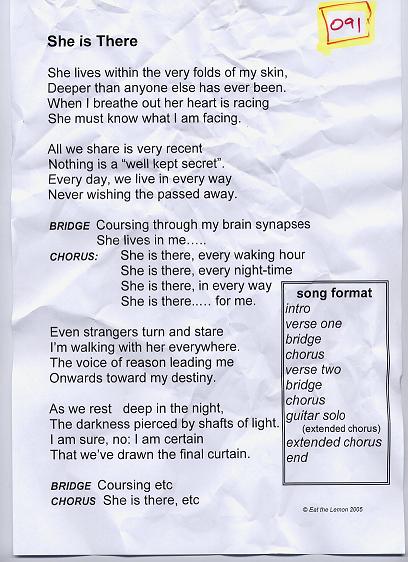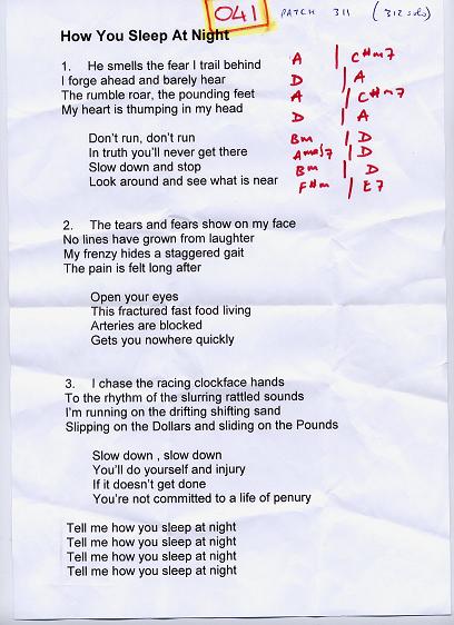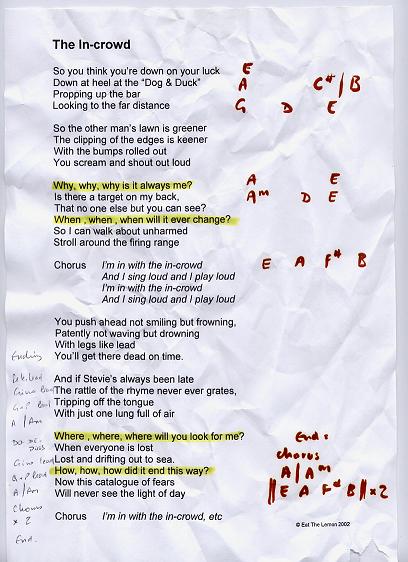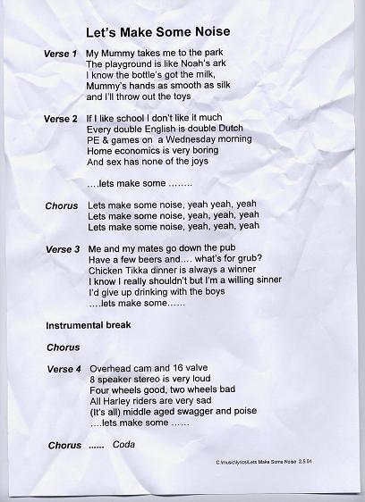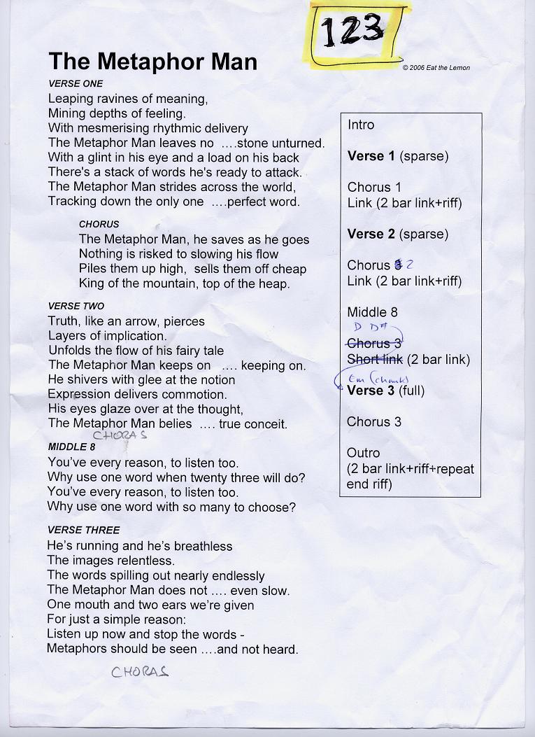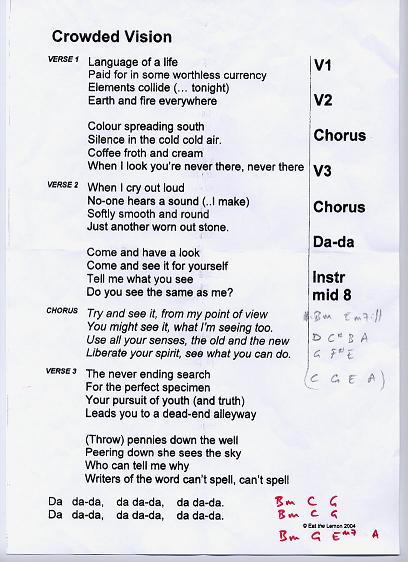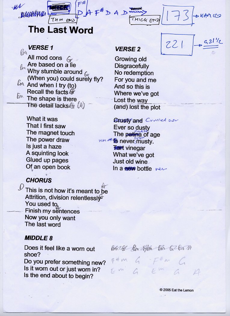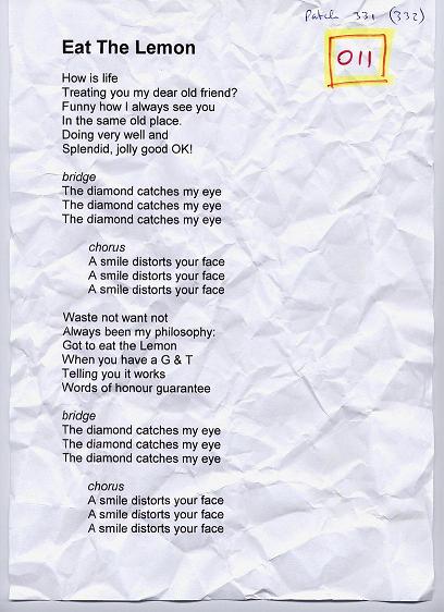 The lyric sheets presented here are the genuine, unedited and - pretty obviously - unadorned lyric sheets straight out of the Eat the Lemon inner sactum. Oh, and one other point: any resemblance or reference to any one living or dead is entirely coincidental and unintentional.